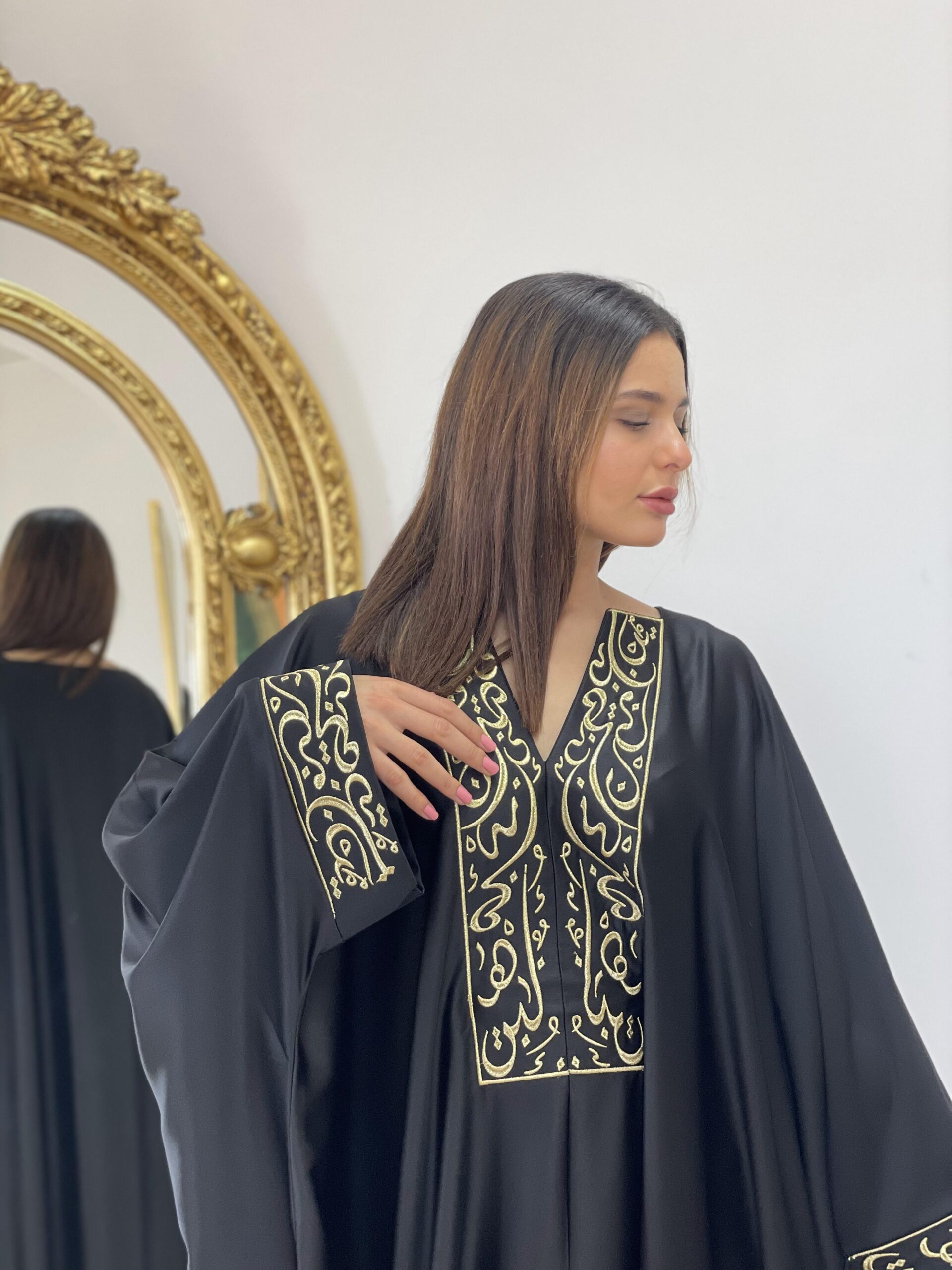 Djebah en soie satinee ornée par une broderie calligraphie au fil doré pour embellir la pièce