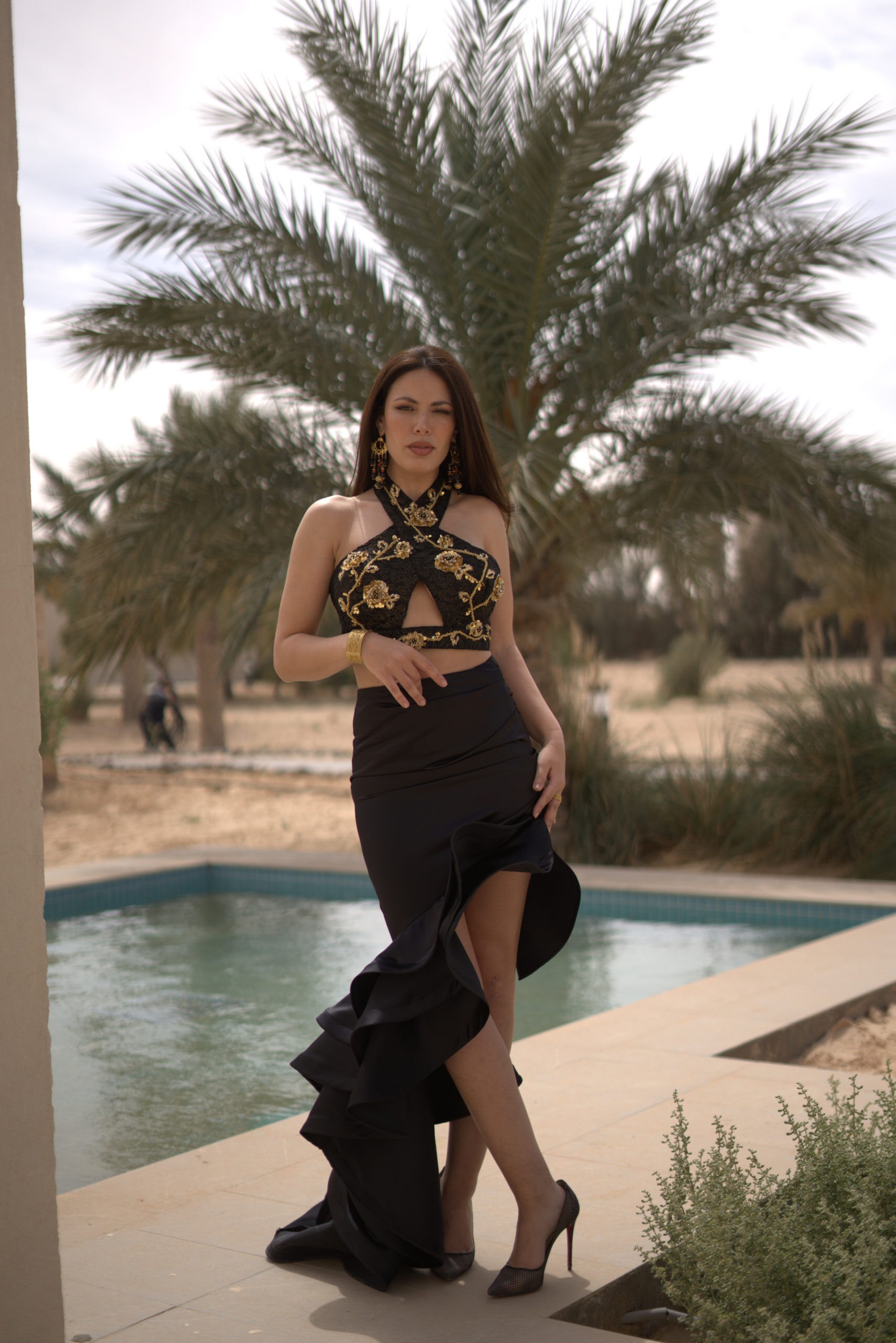 - Fouta : La jupe est noire et moulante, avec une fente haute qui dévoile la jambe et ajoute une note sensuelle. Le bas est sublimé par des volants fluides, apportant du mouvement et une allure glamour.