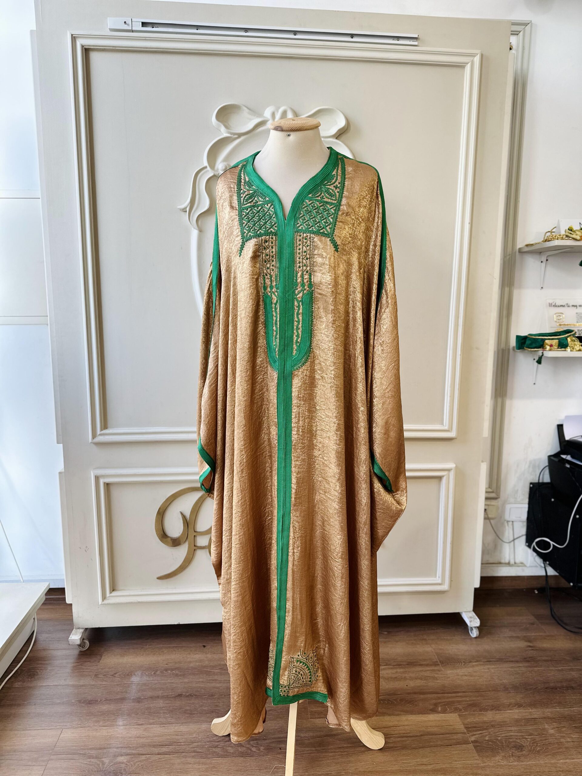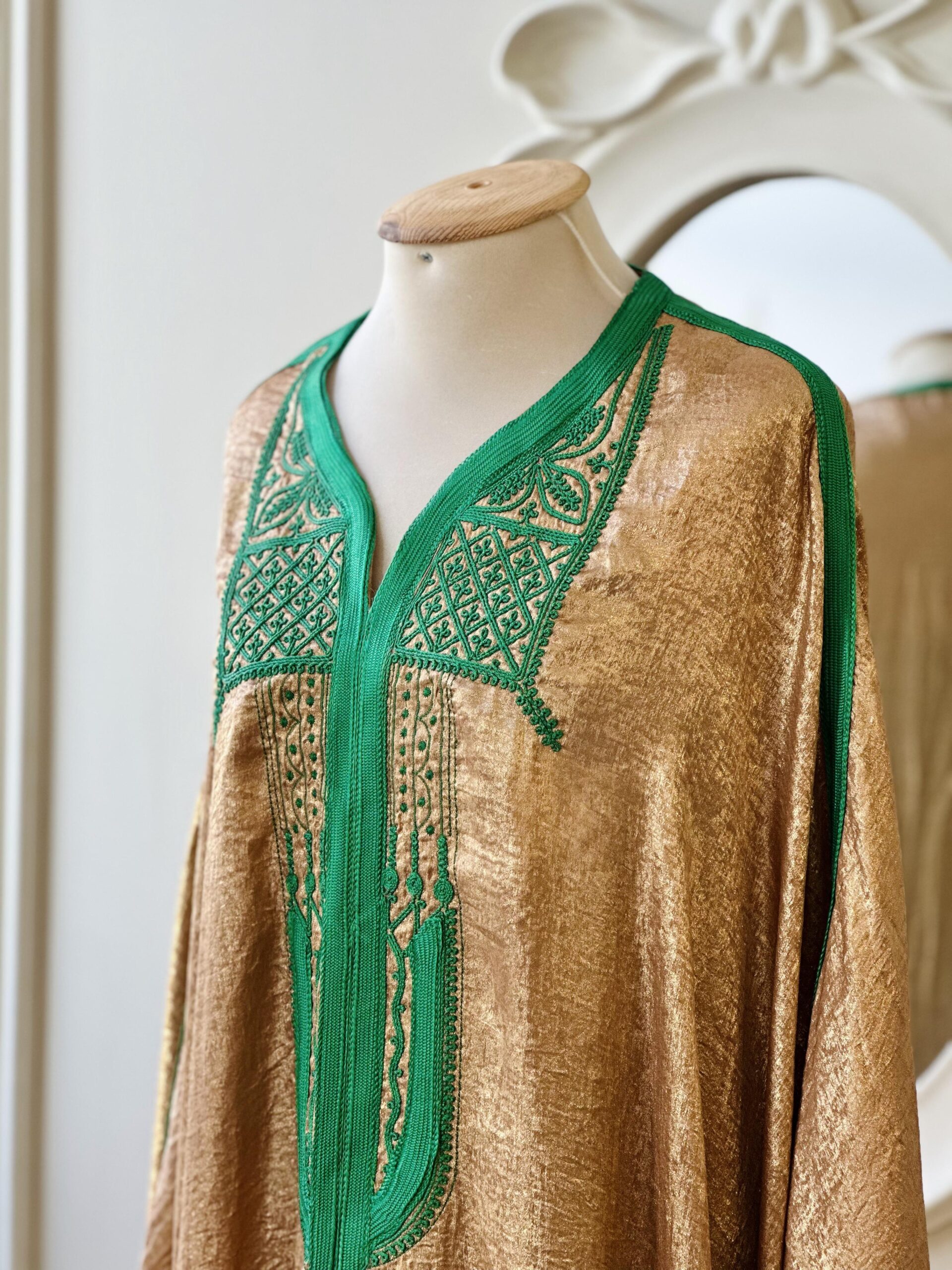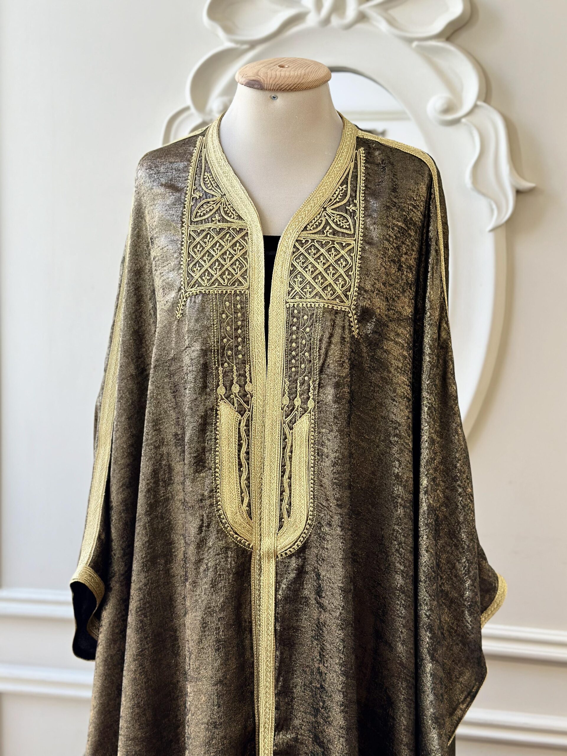 NB: Fentes réglables sur demande | Une somptueuse djebbah soyeuse ajustée par une ceinture en cuivre massif trompée dans l’or aux incrustations de Amber
