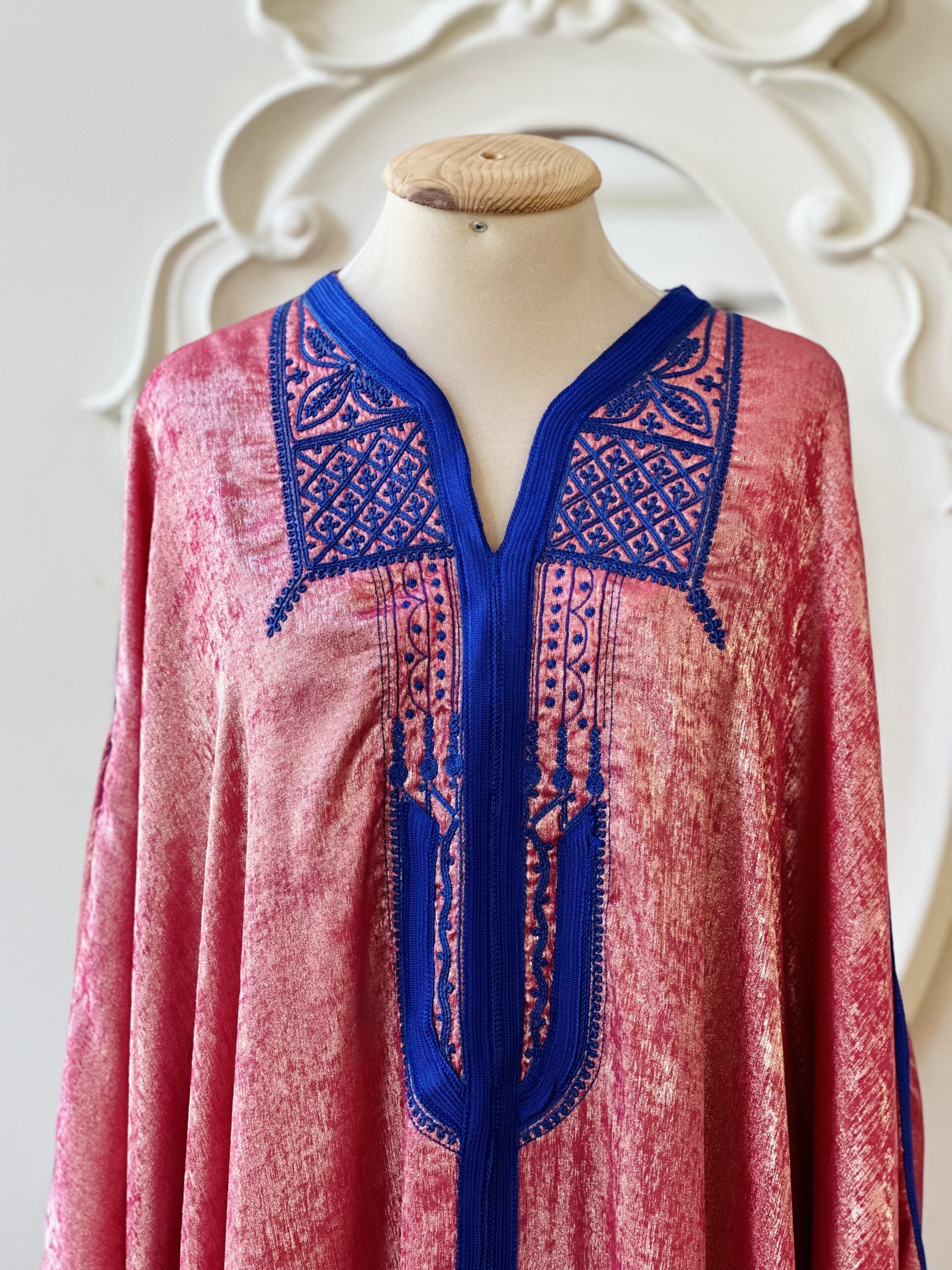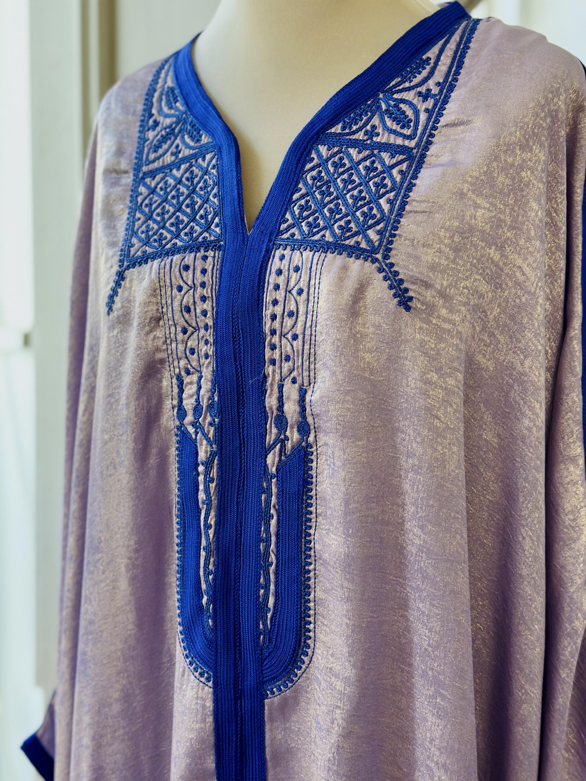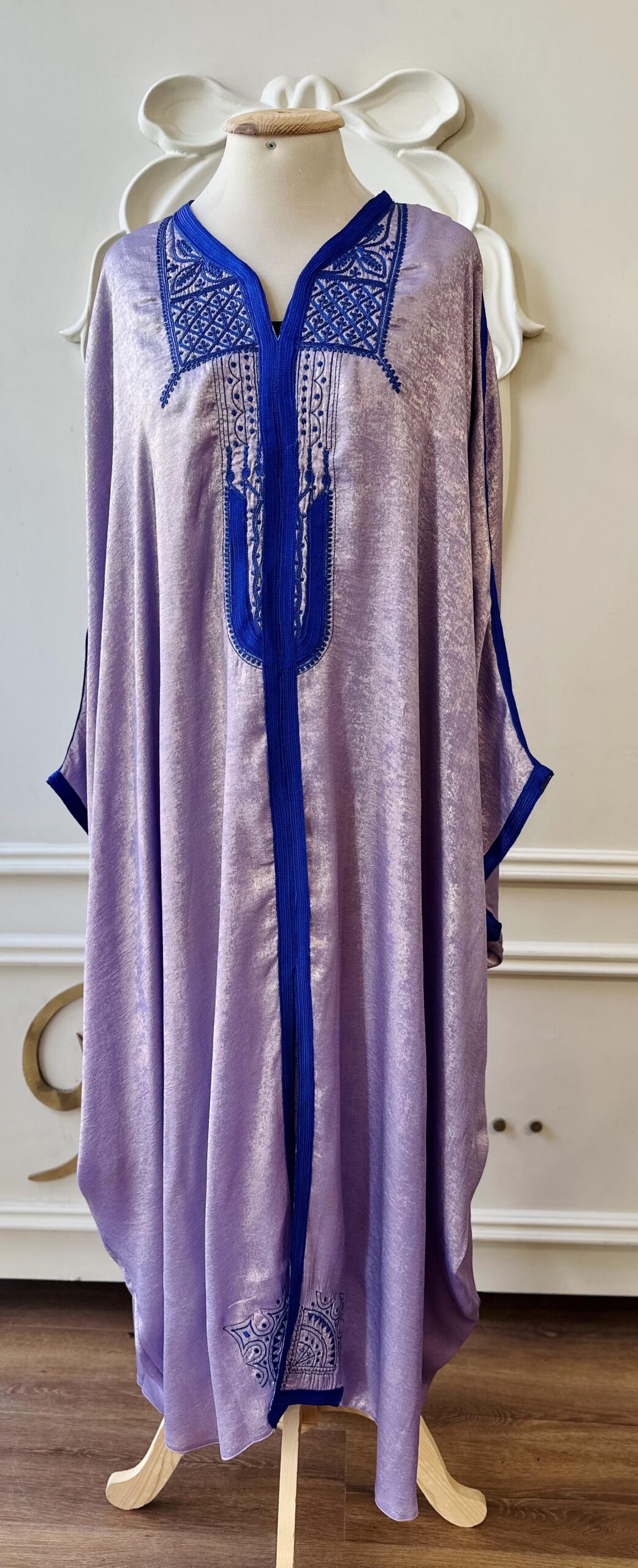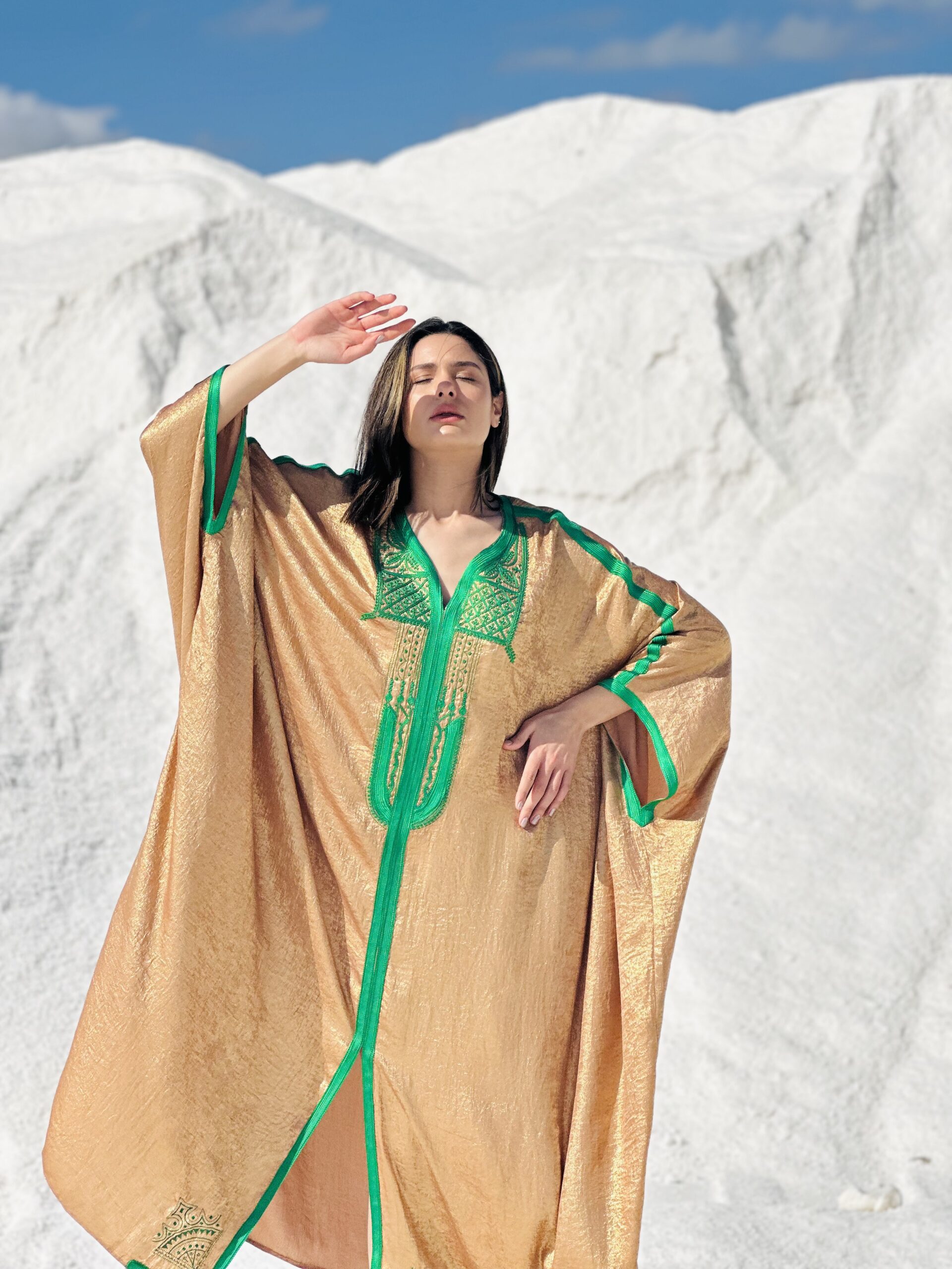 NB: Fentes réglables sur demande | Une somptueuse djebbah soyeuse ajustée par une ceinture en cuivre massif trompée dans l’or aux incrustations de Amber